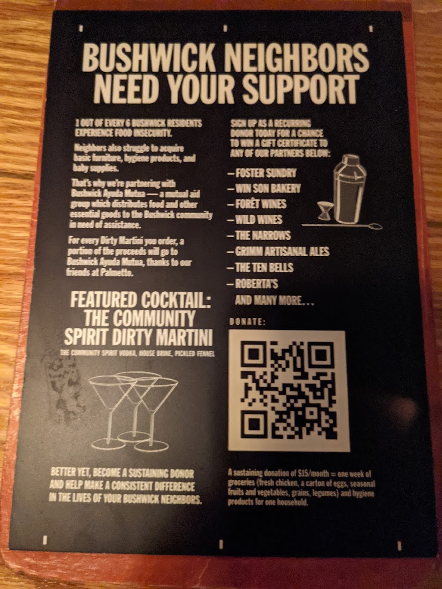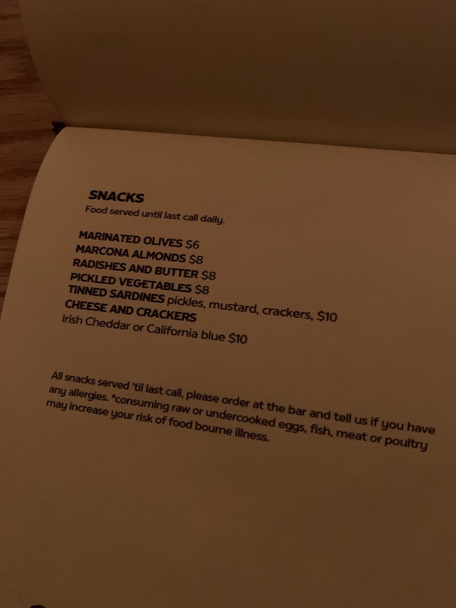 Located in the vibrant heart of Brooklyn, Palmetto offers a charming blend of ambience and delectable bites. Specializing in snacks that perfectly complement their innovative cocktails, the menu features mouthwatering options like Marcona almonds, marinated olives, and artisanal cheese and crackers with seasonal accompaniments.